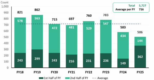 - Historically, the highest number of enforcement actions occurs in the second half of a year; however, the 144 cases initiated in the second half of FY25 were by far the fewest for any half-year analyzed.